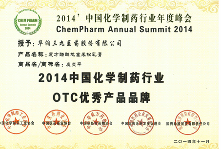 中國化學(xué)制藥行業(yè)年度峰會由中國化學(xué)制藥工業(yè)協(xié)會、中國醫(yī)藥商業(yè)協(xié)會、中國非處方藥物協(xié)會、中國醫(yī)藥企業(yè)發(fā)展促進會、國藥勵展展覽有限責(zé)任公司共同主辦,峰會發(fā)布了“2014中國化學(xué)制藥行業(yè)優(yōu)秀企業(yè)和優(yōu)秀產(chǎn)品品牌”。華潤三九皮炎平與輝瑞的鈣爾奇、中美天津史克的芬必得、西安楊森的達克寧等多個產(chǎn)品品牌一起獲得該項榮譽?! 。ㄍ跖d旺)