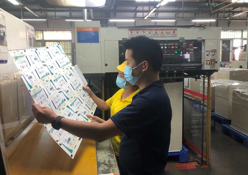 技術(shù)研發(fā)部緊急制作和客戶確認(rèn)產(chǎn)品文件和生產(chǎn)作業(yè)單,采購部協(xié)調(diào)紙張、膠膜、紙箱等物料快速到位,生產(chǎn)系統(tǒng)統(tǒng)籌協(xié)調(diào)規(guī)劃產(chǎn)線。24日晚,前期文件等準(zhǔn)備工作和材料全部到位。25日早8點,客戶到公司車間機(jī)印刷現(xiàn)場確定顏色,9點半簽樣完成,2臺印刷機(jī)高速生產(chǎn)。