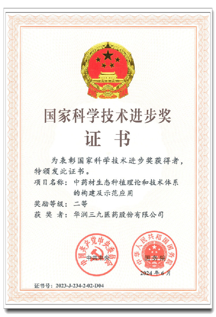 2023年度國家科學技術獎勵大會日前在北京舉行。會上,華潤三九參與的《中藥材生態(tài)種植理論和技術體系的構建及示范應用》項目再次榮獲國家科學技術進步獎二等獎,這是對企業(yè)高度重視研發(fā)創(chuàng)新并取得豐碩成果的肯定。此前,以公司產品 “參附注射液”“紅花注射液”“參麥注射液”“新泰林”“999理洫王牌血塞通三七軟膠囊”“青蒿系列”為研究對象的科研項目,先后榮獲國家科學技術進步獎二等獎。