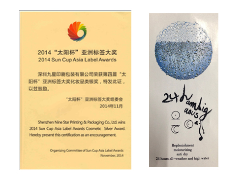 標(biāo)簽行業(yè)極具影響力的2014“太陽(yáng)杯”亞洲標(biāo)簽大獎(jiǎng)?lì)C獎(jiǎng)盛典,近日在上海舉行。九星印刷選送作品“NS 24小時(shí)高效補(bǔ)水面霜標(biāo)簽”榮獲化妝品類(lèi)銀獎(jiǎng)。