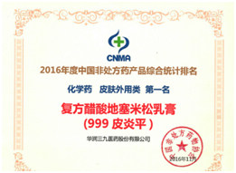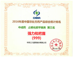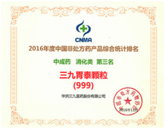 在產(chǎn)品品牌統(tǒng)計排名中,華潤三九感冒‘’靈顆粒/膠囊自2009年以來連續(xù)七年獲得中成藥類感冒咳嗽類產(chǎn)品排名第一名,復方醋酸地塞米松乳膏(999皮炎平)榮獲化學藥類皮膚外用藥類第一名,三九胃泰榮獲中成藥類消化類藥物第三名,強力枇杷露榮獲中成藥類止咳化痰平喘類藥物第三名的好成績。多年來,華潤三九持續(xù)蟬聯(lián)行業(yè)企業(yè)排行榜首位,多個產(chǎn)品連續(xù)位居排行榜前茅,一方面顯示了企業(yè)在非處方藥物領域的領導地位,另一方面提升了公司產(chǎn)品在消費者心中的地位,使消費者更加信賴華潤三九的有關產(chǎn)品。