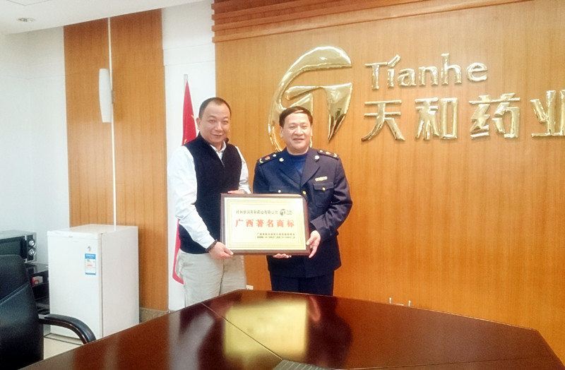 廣西壯族自治區(qū)工商局近日下發(fā)《關(guān)于認(rèn)定廣西著名商標(biāo)的通知》,桂林華潤天和藥業(yè)有限公司榜上有名,其“天和”及“伏波山”商標(biāo)雙雙再度通過復(fù)審,被認(rèn)定為廣西著名商標(biāo)。2016年2月2日,桂林市工商行政管理局劉副局長(右)一行前來公司頒發(fā)廣西著名商標(biāo)牌匾。